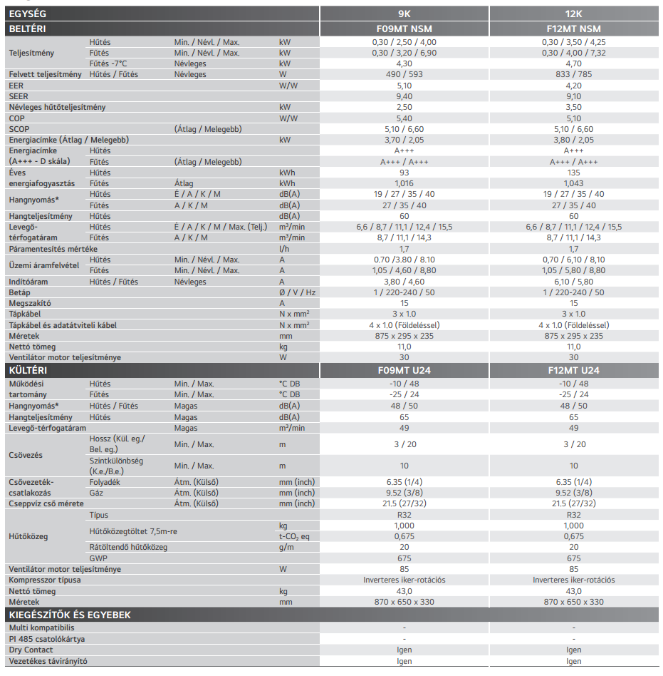 Felszerelés és beüzemelés díja bruttó 55.000 Ft, mely tartalmazza a kiszállást, a készülék helyszínre szállítását, a kültéri és beltéri egység felszerelését, elektromos betáp kiépítését aljzatba max. 5 méterig*, a kültéri tartókonzolt, rögzítő elemeket, a vákuumozást, a berendezés beüzemelését és azzal kapcsolatos dokumentumok kitöltését (pl.: beüzemelési jegyzőkönyv, garanciajegy...), valamint a takarítást.
